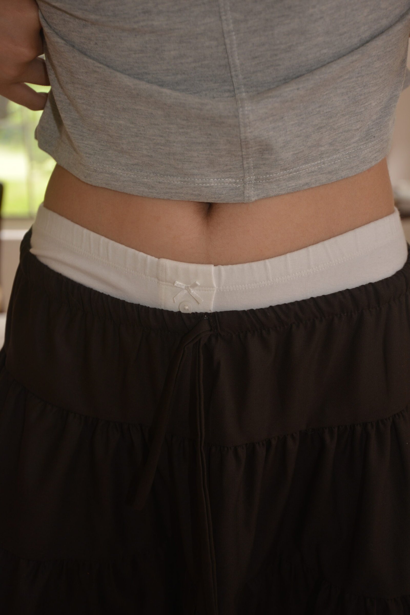 The Basset Skirt is a multi-tiered midi skirt with an elastic waistband and drawstring.